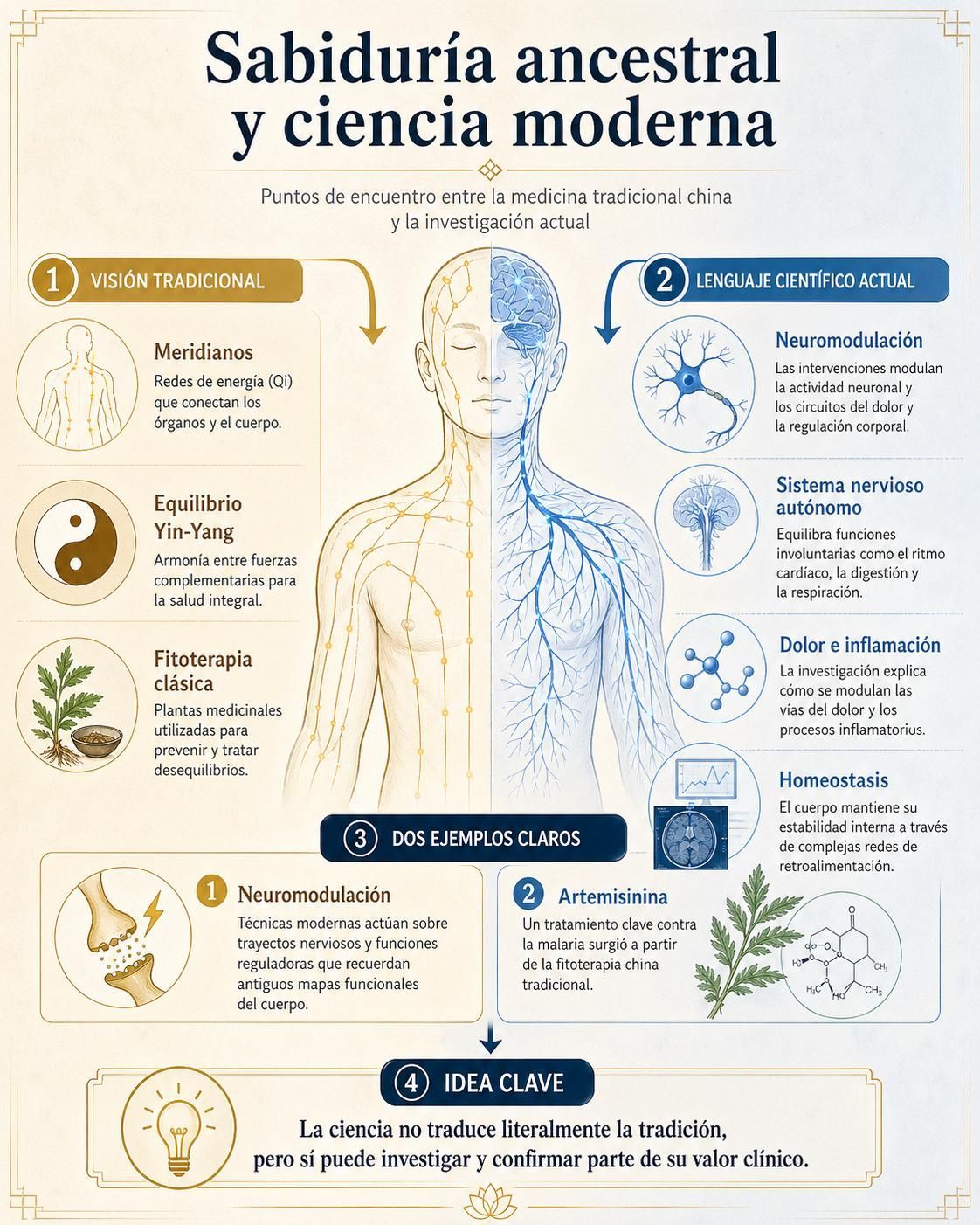 Durante siglos, la medicina tradicional china observó el cuerpo desde una mirada global: circulación de energía, equilibrio entre órganos, relación entre emociones, sistema nervioso, digestión, descanso y dolor. Hoy, la ciencia moderna empieza a estudiar muchos de esos fenómenos con otro lenguaje: sistema nervioso autónomo, inflamación, neuromodulación, fascia, neurotransmisores, eje intestino-cerebro o regulación vagal.